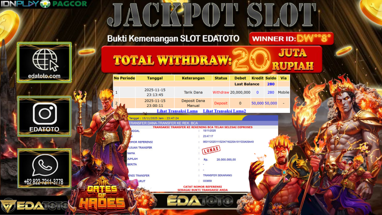 Selamat Kepada Pemilik user ID : DW**8* Hari/Tanggal :Minggu / 16, November 2025 Jackpot : Rp. 18,700,000 JT Withdraw :20,000,000 JT . . .
