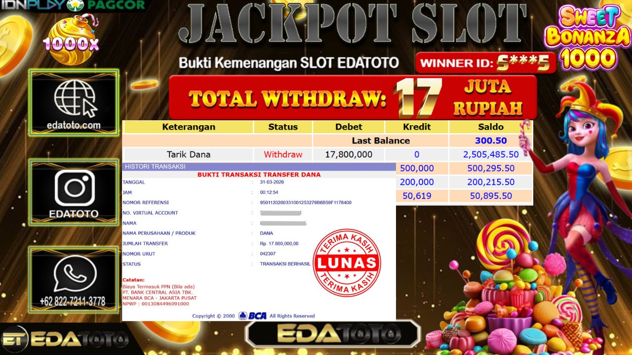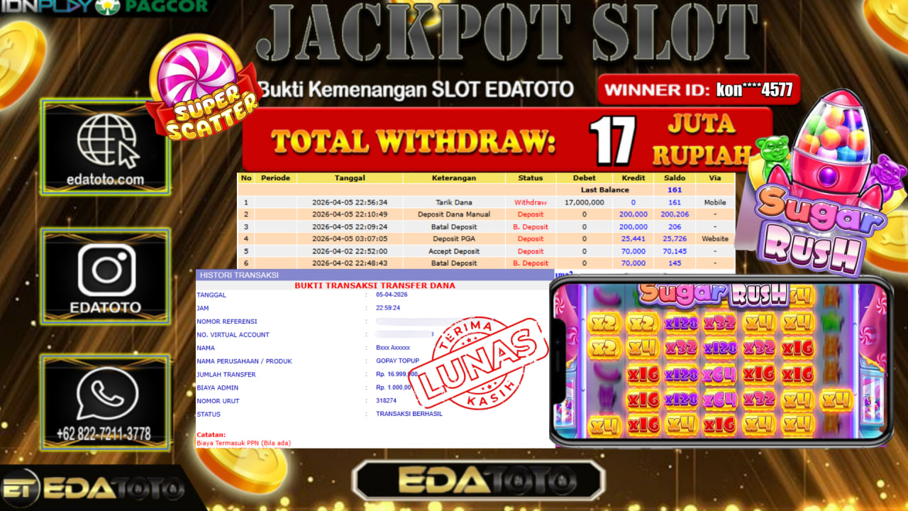 Selamat Kepada Pemilik user ID : kon****4577 Hari/Tanggal : Minggu / 05 APRIL 2026 Jackpot : Rp, 17,000,000JT Withdraw : . . .