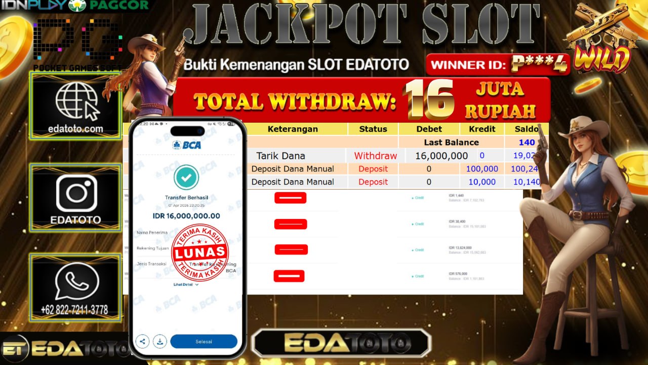 Selamat Kepada Pemilik user ID : P***4 Hari/Tanggal : Rabu / 01 APRIL 2026 Jackpot : Rp, 12,000,000 JT Withdraw . . .