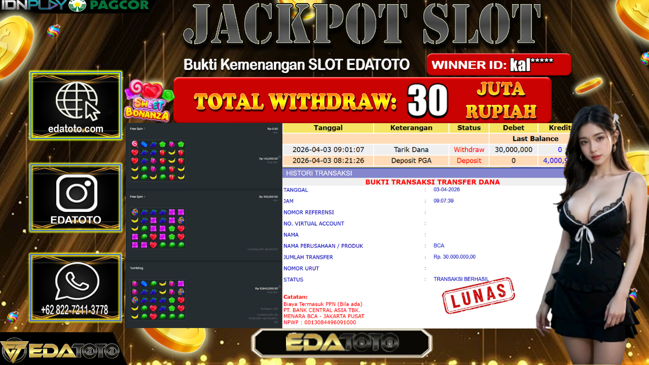 Selamat Kepada Pemilik user ID : Kal***** Hari/Tanggal : Jumat/ 03 APRIL 2026 Jackpot : Rp, 25,710,024 JT Withdraw : . . .