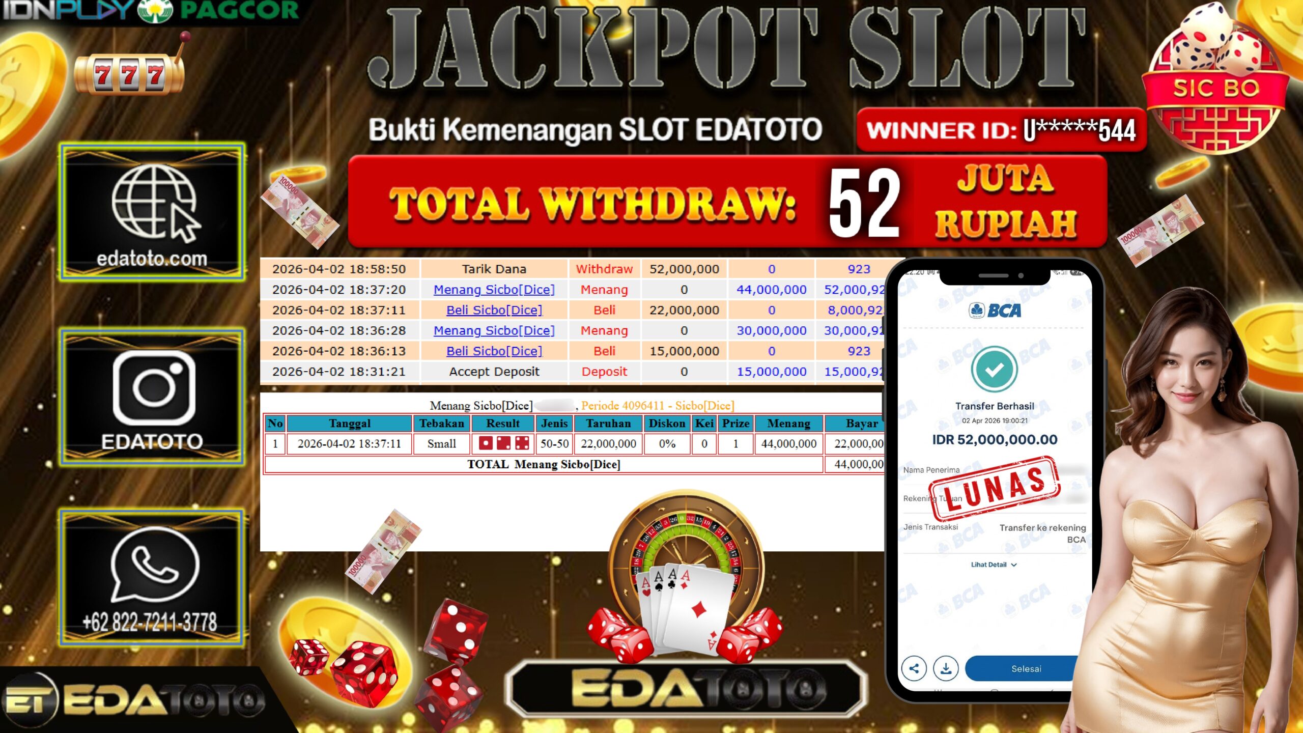 Selamat Kepada Pemilik user ID : U*****544 Hari/Tanggal : Kamis / 02 APRIL 2026 Jackpot : Rp, 44,000,000 JT Withdraw . . .