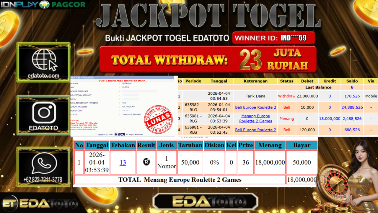 Selamat Kepada Pemilik user ID : IND****59 Hari/Tanggal : Sabtu/ 04 APRIL 2026 Jackpot : Rp, 18,000,000 JT Withdraw : . . .