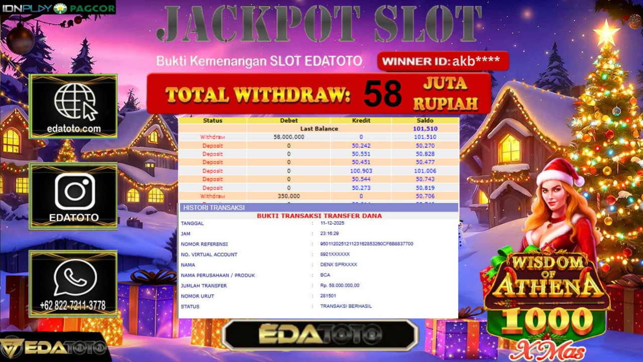 Selamat Kepada Pemilik user ID : akb**** Hari/Tanggal :kamis/ 11, Desember 2025 Jackpot : Rp. 58,000,000 JT Withdraw :58,000,000 JT . . .