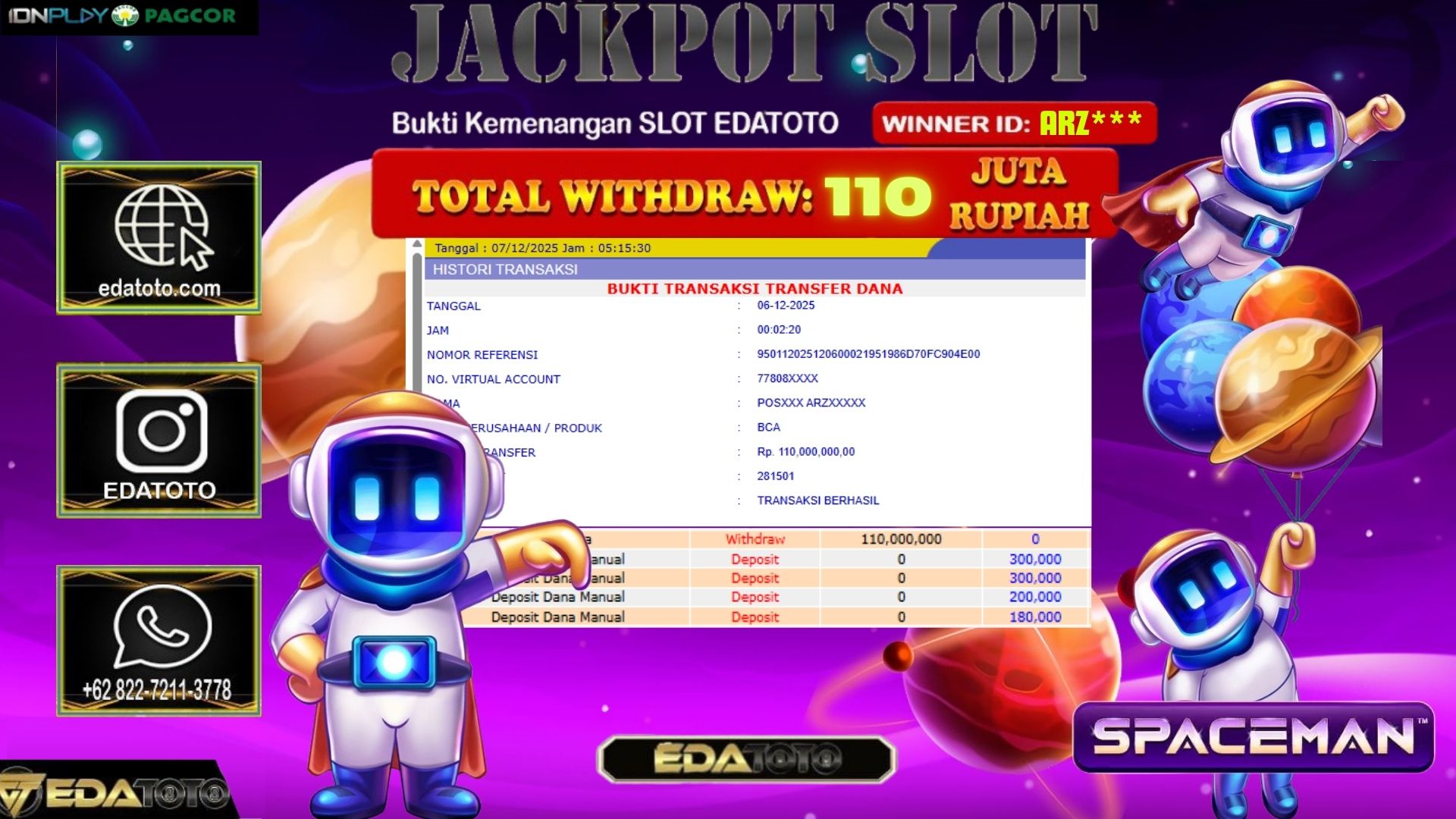 Selamat Kepada Pemilik user ID : ARZ*** Hari/Tanggal :SABTU / 6, Desember 2025 Jackpot : Rp. 110,000,000 JT Withdraw :110,000,000 . . .
