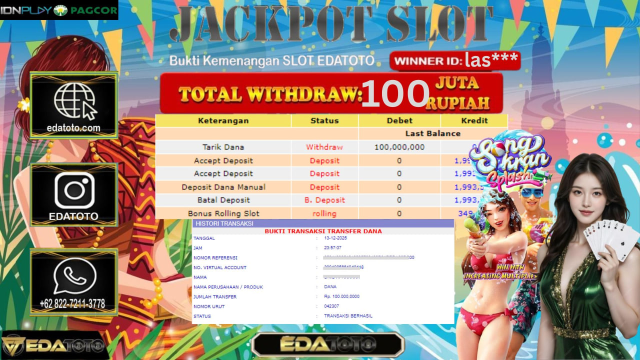 Selamat Kepada Pemilik user ID : las*** Hari/Tanggal :kamis/ 13, Desember 2025 Jackpot : Rp. 100,000,000 JT Withdraw :100,000,000 JT . . .