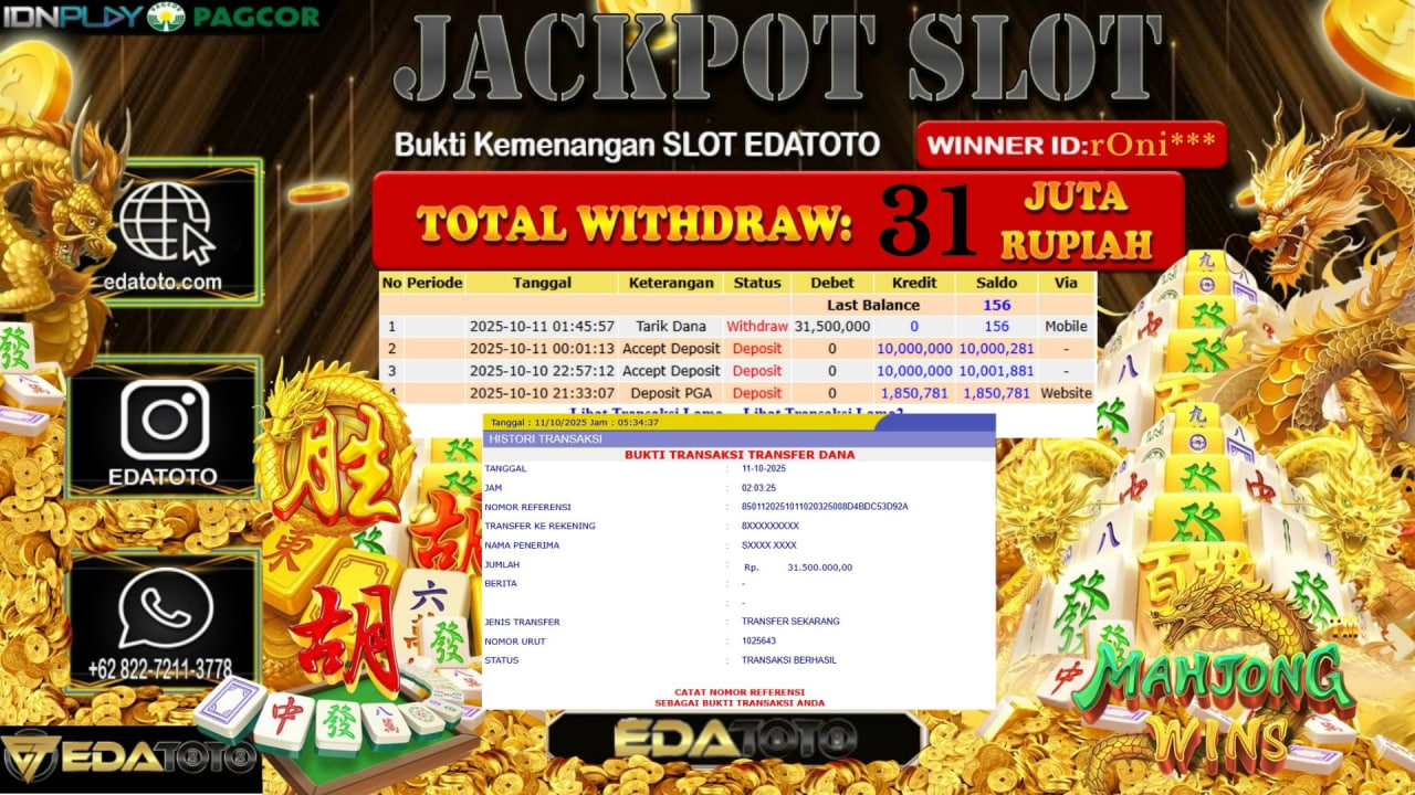 Selamat Kepada Pemilik user ID : rOni*** Hari/Tanggal : Sabtu/ 11, Oktober 2025 Jackpot : Rp. 31.500.000 JT Permainan :Mahjong . . .