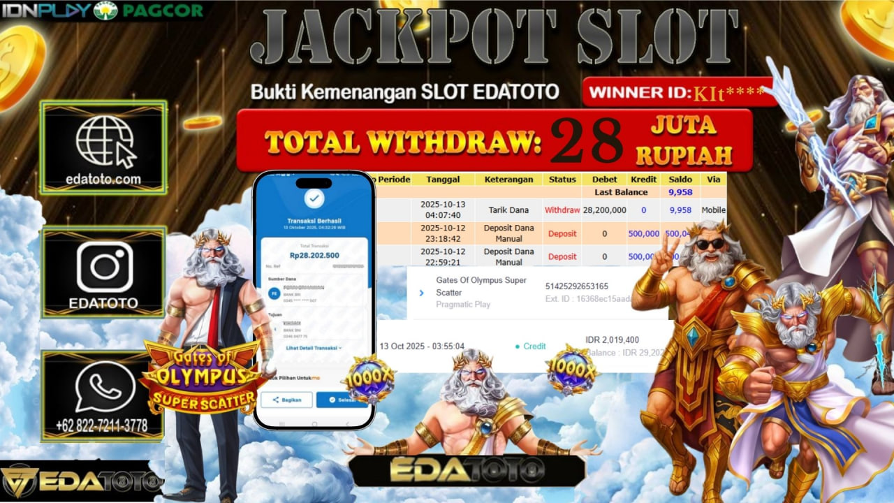 Selamat Kepada Pemilik user ID : KIt**** Hari/Tanggal : Senin / 13, Oktober 2025 Jackpot : Rp. 28.200.000 JT Permainan . . .