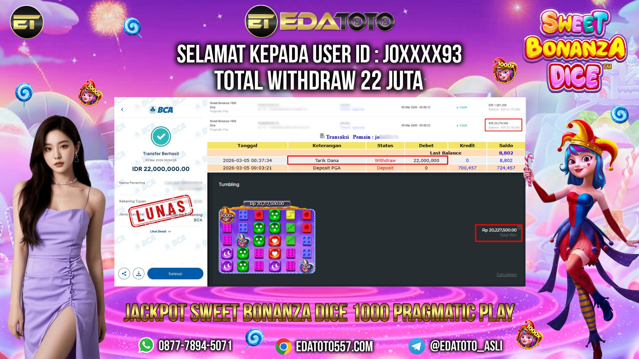 Selamat Kepada Pemilik user ID :JO****93 Hari/Tanggal : Kamis / 05 MARET 2026 Jackpot : Rp,  20,227,500 JT Withdraw : . . .