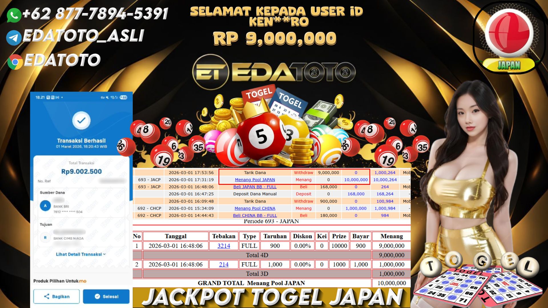 Selamat Kepada Pemilik user ID : KEN**RO Hari/Tanggal : MINGGU / 01 MARET 2026 Jackpot : Rp,  10,000,000 JT Withdraw . . .
