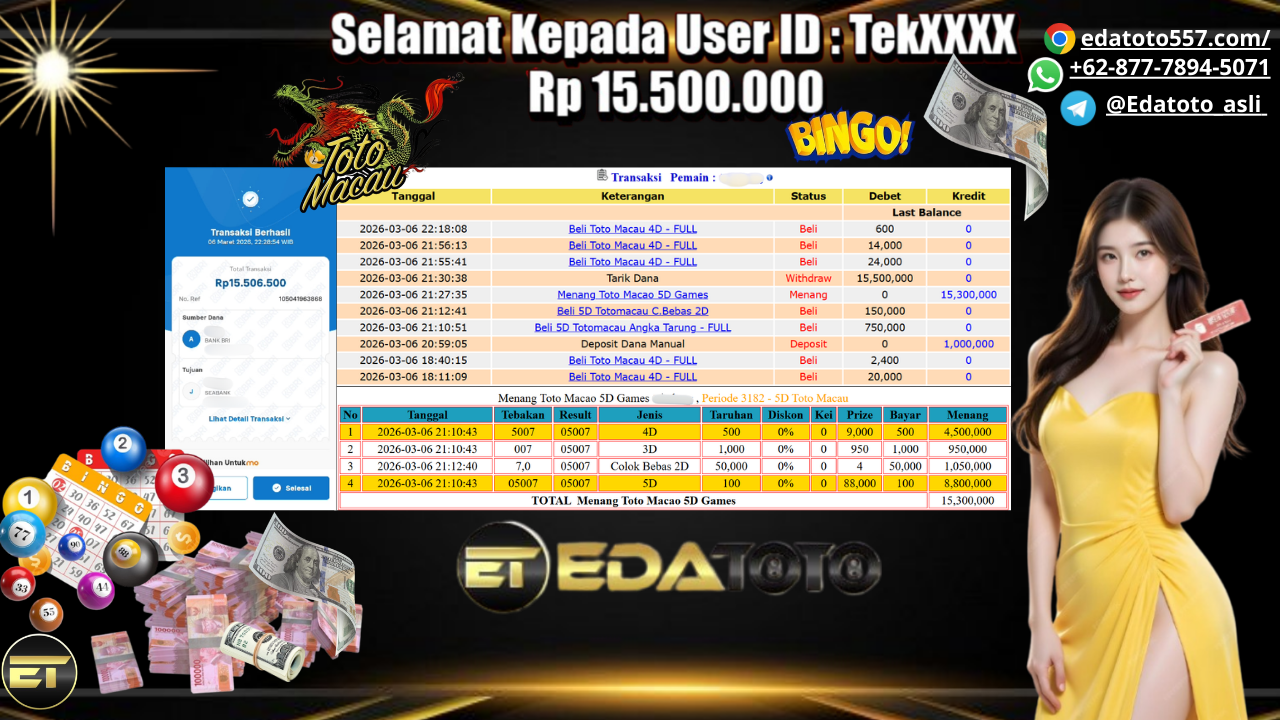 Selamat Kepada Pemilik user ID :Tek**** Hari/Tanggal : Jumat / 06 MARET 2026 Jackpot : Rp,  15,300,000 JT Withdraw : . . .