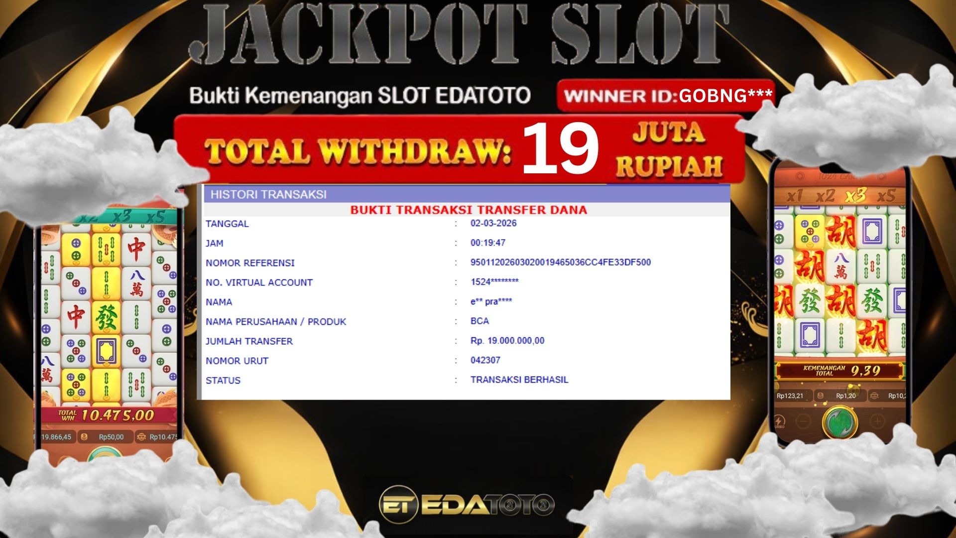 Selamat Kepada Pemilik user ID : GOBNG*** Hari/Tanggal : SENIN / 02 MARET 2026 Jackpot : Rp,  23,000,000 JT Withdraw . . .