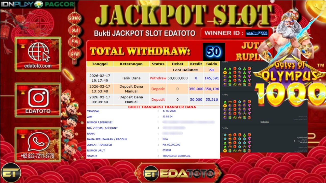 Selamat Kepada Pemilik user ID : PE***0 Hari/Tanggal : Rabu/ 18 februari 2026 Jackpot : Rp, 43,000,000 JT Withdraw : . . .
