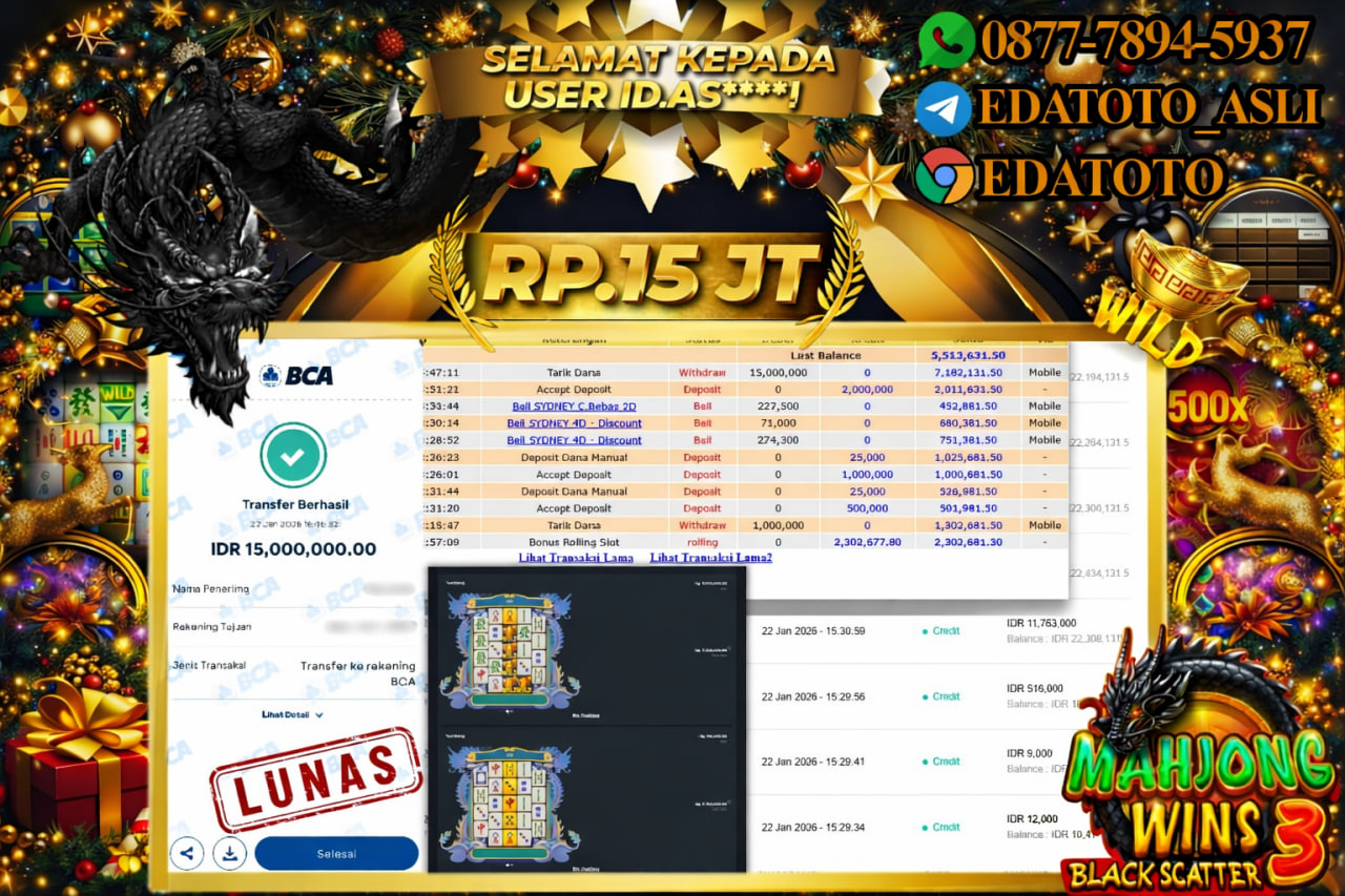 Selamat Kepada Pemilik user ID : AS****! Hari/Tanggal :kamis/ 22, Januari 2026 Jackpot : Rp. 15,000,000 JT Withdraw : 15,000,000 . . .